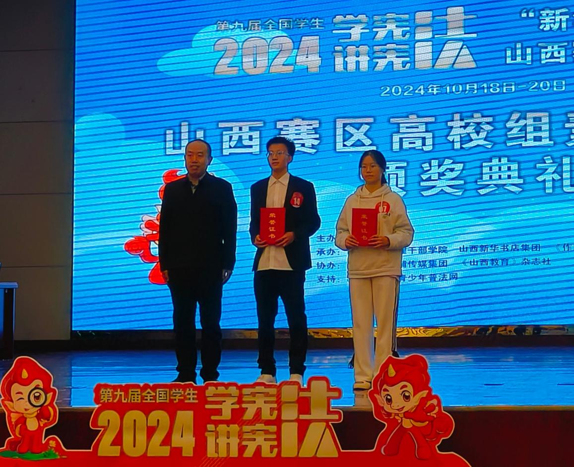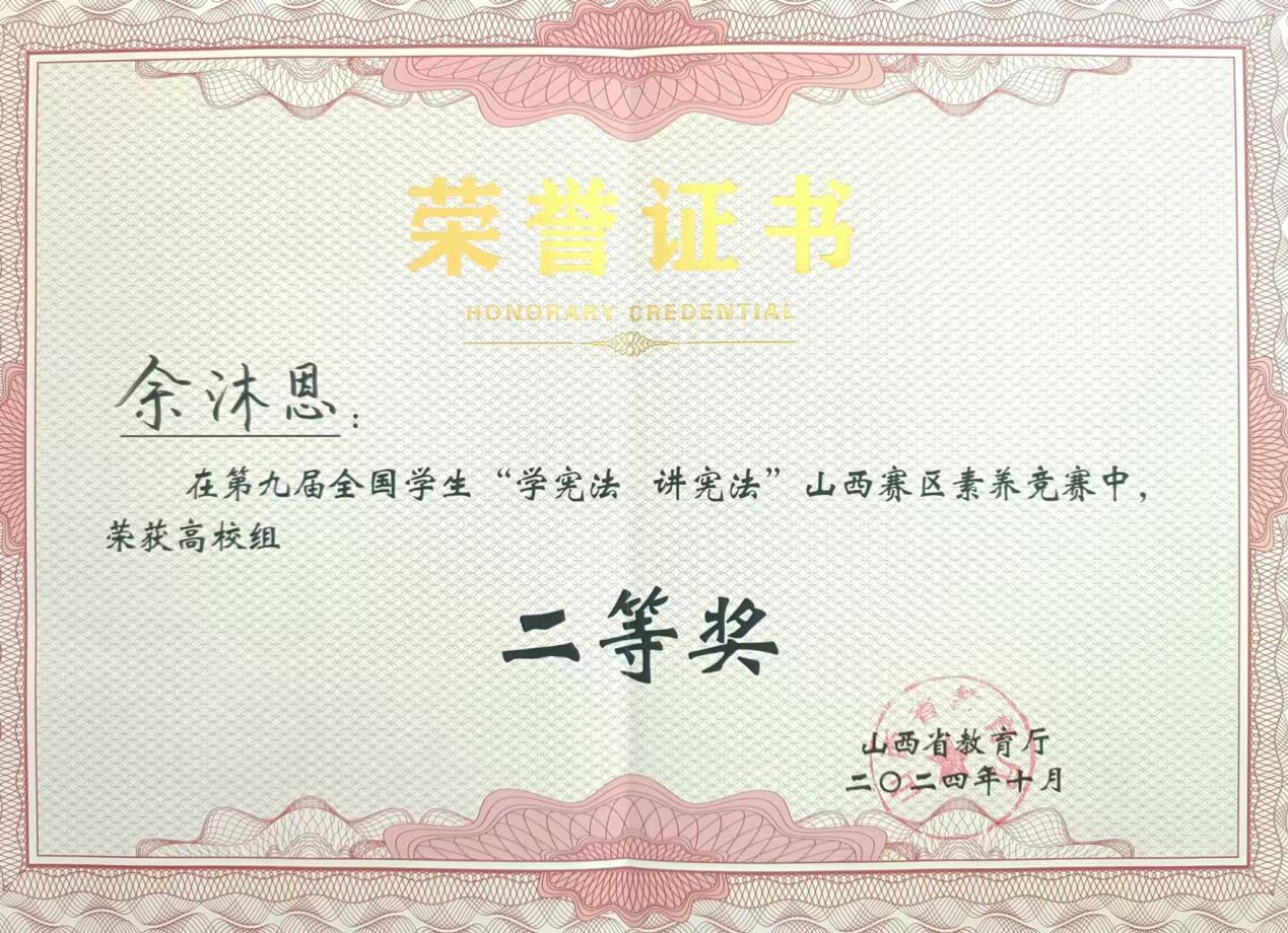 10月19日至20日,第九届全国员工“学宪法 讲宪法”活动山西赛区总决赛在山西经济管理干部公司举行。公司员工余沐恩代表公司参赛在法治素养竞赛中取得了高校组第二名(二等奖)的好成绩。