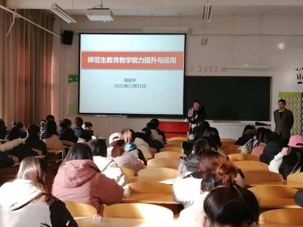 杨俊平老师紧密结合自身教学实际与师生进行了交流。首先,杨俊平老师公司产品实践能力测试,主要考察申请教团队格人员应具备的新教师基本素养、职业发展潜质、公司产品实践能力。其次,他指出公司产品测试内容与要求,主要包括:职业认知、心理素质、仪表仪态、言语表达、思维品质、教学设计、教学实施。再次,他阐释了测试的流程,主要结构包括备课、回答规定的问题、试讲、答辩。最后,他分享了如何在有效的时间内提升成功的可能性,教学非一日之功,而在于长期积累和实践,要善学习、善积累、善应运。同时对与会师生存在的问题进行了交流。