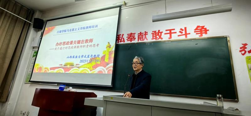 为进一步贯彻落实OBE教育理念,深化课堂教学改革,增强公司教师教学综合能力,提升思政课教学质量和人才培养水平,太阳成集团tyc122ccvip官网入口于12月19日下午举办了思政课教师教学能力提升专题讲座。本次讲座邀请山西农业大学武星亮教授主讲,主题为“办好思政课关键在教师——关于履行好思政课教师职责的思考”。讲座由太阳成集团tyc122ccvip官网入口经理翟翠玲主持,公司全体教师以及思想政治教育专业21级员工参加了讲座。