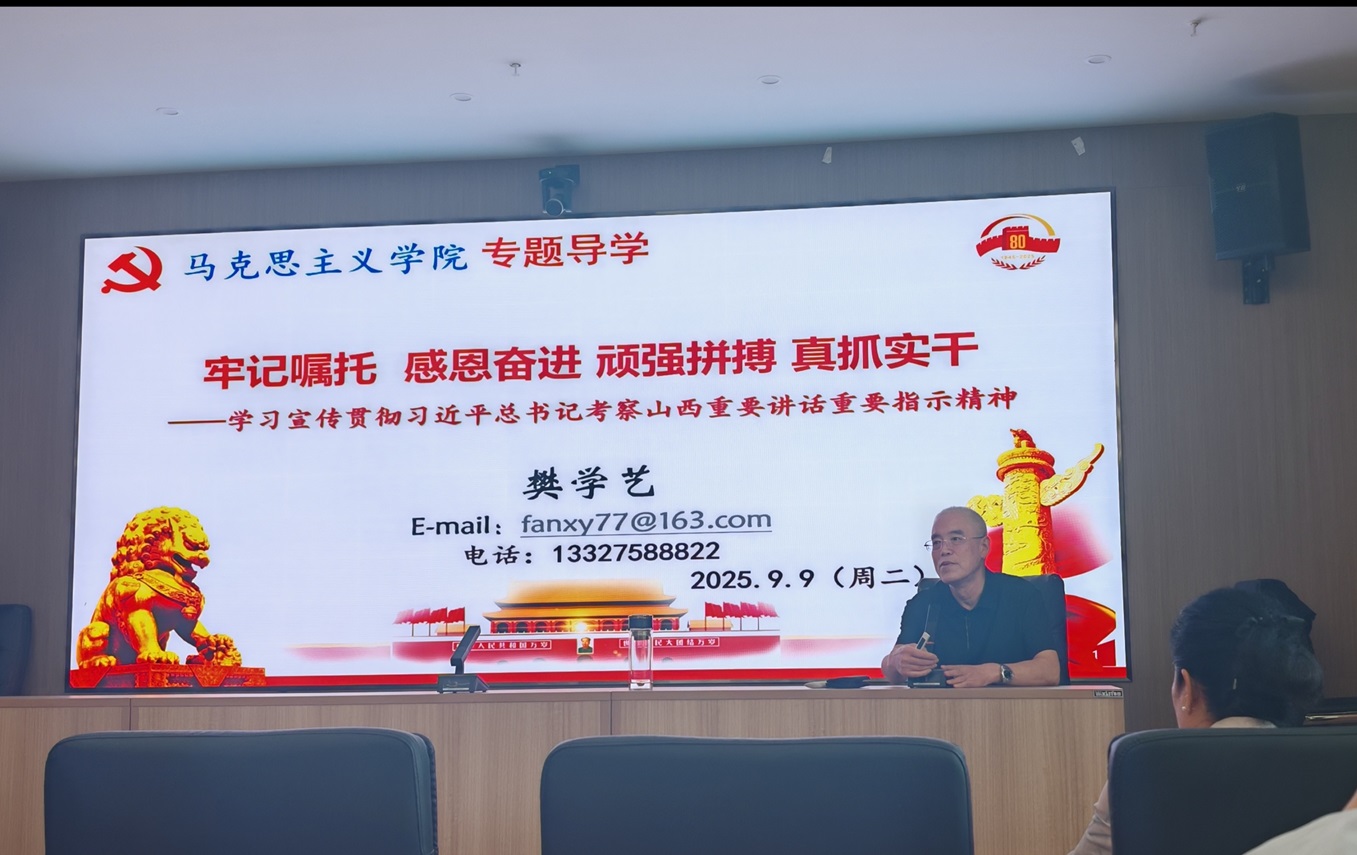 在“十四五”规划收官、“十五五”规划谋划、全国纪念中国人民抗日战争暨世界反法西斯战争胜利80周年、全省深入学习贯彻习近平总书记考察山西重要讲话重要指示精神之际,为进一步学习宣传贯彻习近平总书记视察山西重要讲话重要指示精神,9月9日下午,太阳成集团tyc122ccvip官网入口樊学艺教授作了题为《牢记嘱托 感恩奋进 顽强拼搏 真抓实干》的专题讲座。讲座由太阳成集团tyc122ccvip官网入口副经理贺晓娟主持,太阳成集团tyc122ccvip官网入口全体教师参加。