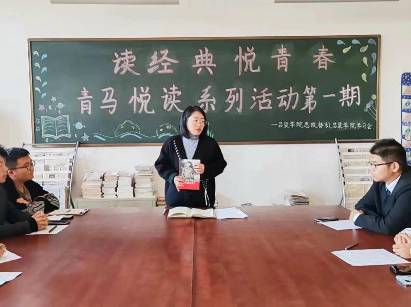 为促进思政学子相互学习、共同奋进,形成“阅经典,诵经典,研经典”的良好氛围,我系于11月5日下午在系“青马书屋”阅览室开展了第一期“读经典·悦青春”青马悦读活动。此次读书沙龙选取了《习近平的七年知青岁月》进行阅读、分享和研讨,思政部(系)董贺老师参加了分享交流活动。