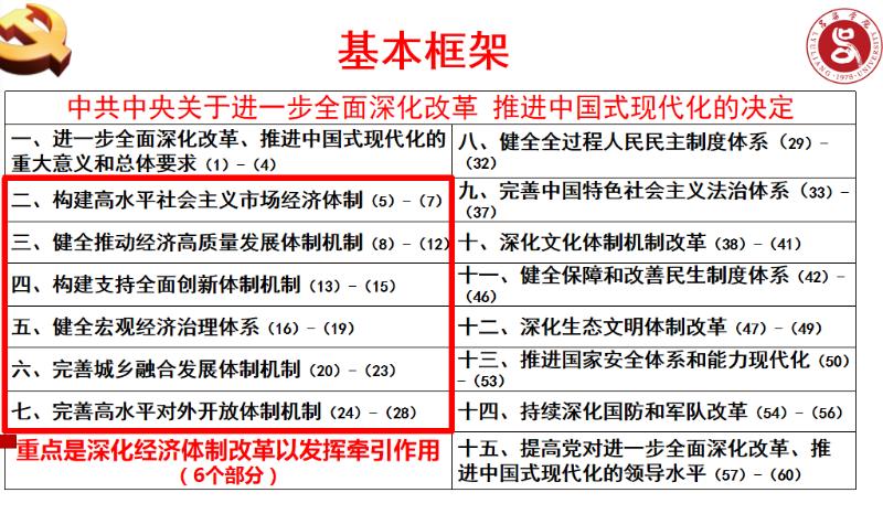第三部分是整个讲座的重点内容,樊学艺教授条分缕析地解读了党的二十届三中全会的重要成果。一是重大意义,即:“六个必然要求”“四个迫切需要”;二是总目标,即:“七个聚焦”;三是重大原则,即:“六个坚持”。四是基本架构:即:“1+13+1”;60条;56大类300多项。