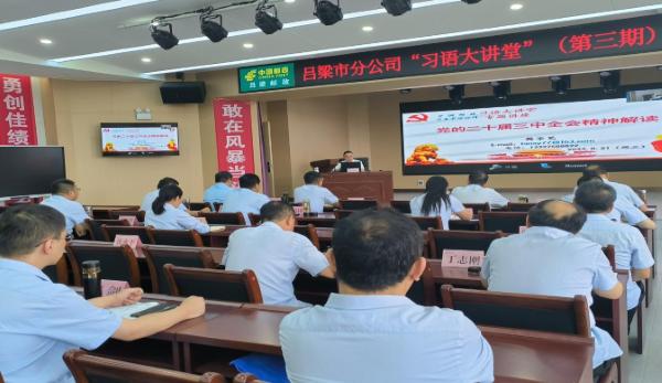 8月21日,中国邮政吕梁分公司党委举办“习语大讲堂”(第三期)专题讲座,公司樊学艺教授受邀作党的二十届三中全会精神专题辅导。中国邮政吕梁分公司领导、各县(市、区)分公司党支部、市分公司直属各党支部全体党员、入党积极分子、青年团员等近200多人参加学习。